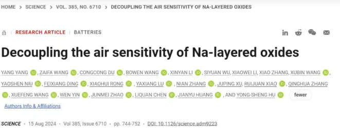 长三角物理研究中心容晓晖特聘研究员与中国科学院物理研究所胡勇胜研究员、陆雅翔副研究员、燕山大学黄建宇教授合作,以“Decoupling the air sensitivity of Na-layered oxides”为题在《科学》(Science)杂志上发表。